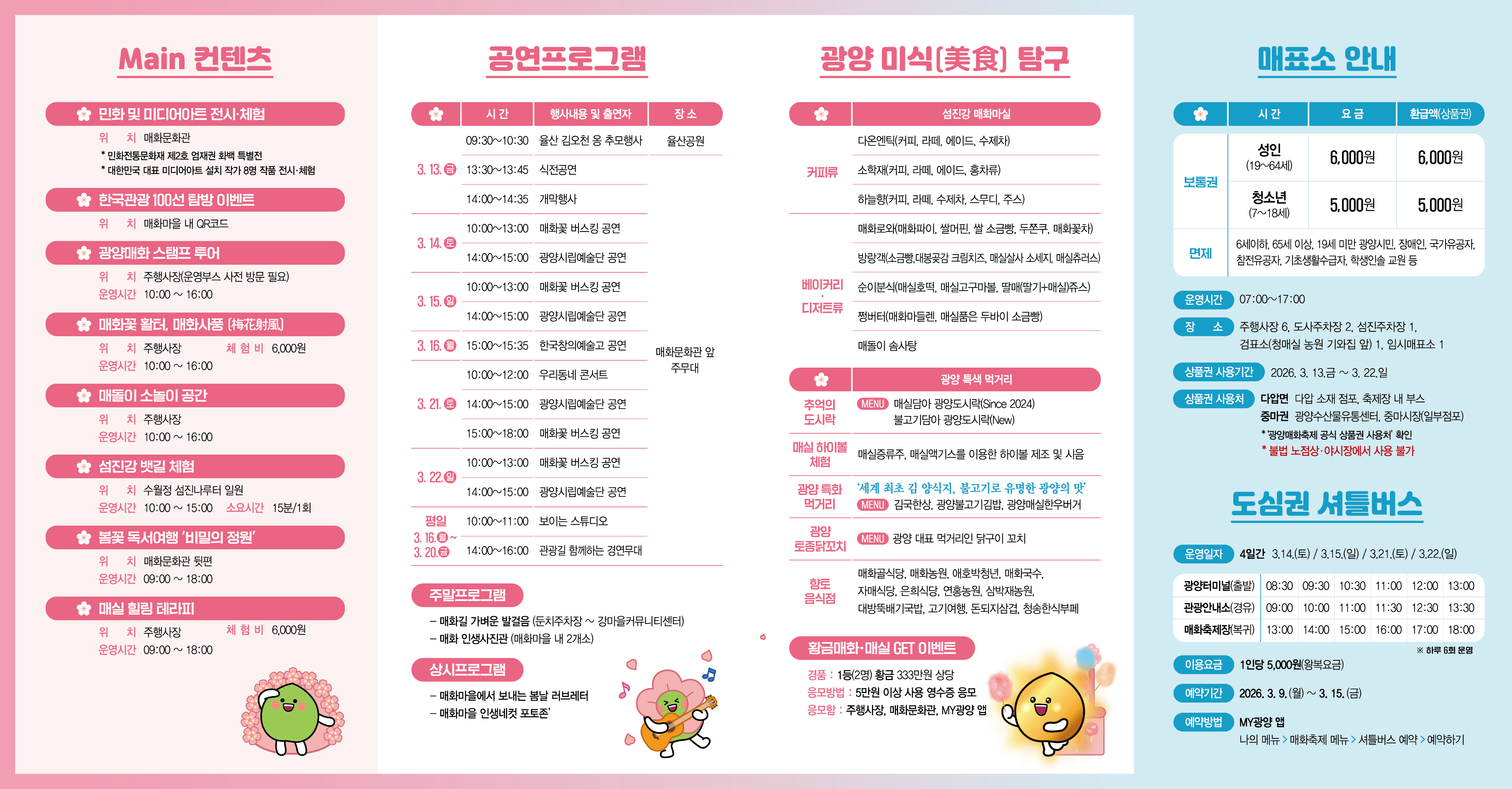 A. 광양시 문화관광 페이지 2026년 안내에 따르면 3월 14일, 15일, 21일, 22일에 운영돼요. 광양시 2026년 3월 5일 보도자료에는 하루 6회 왕복 운행, 45인승, 왕복 5,000원으로 적혀 있어요.